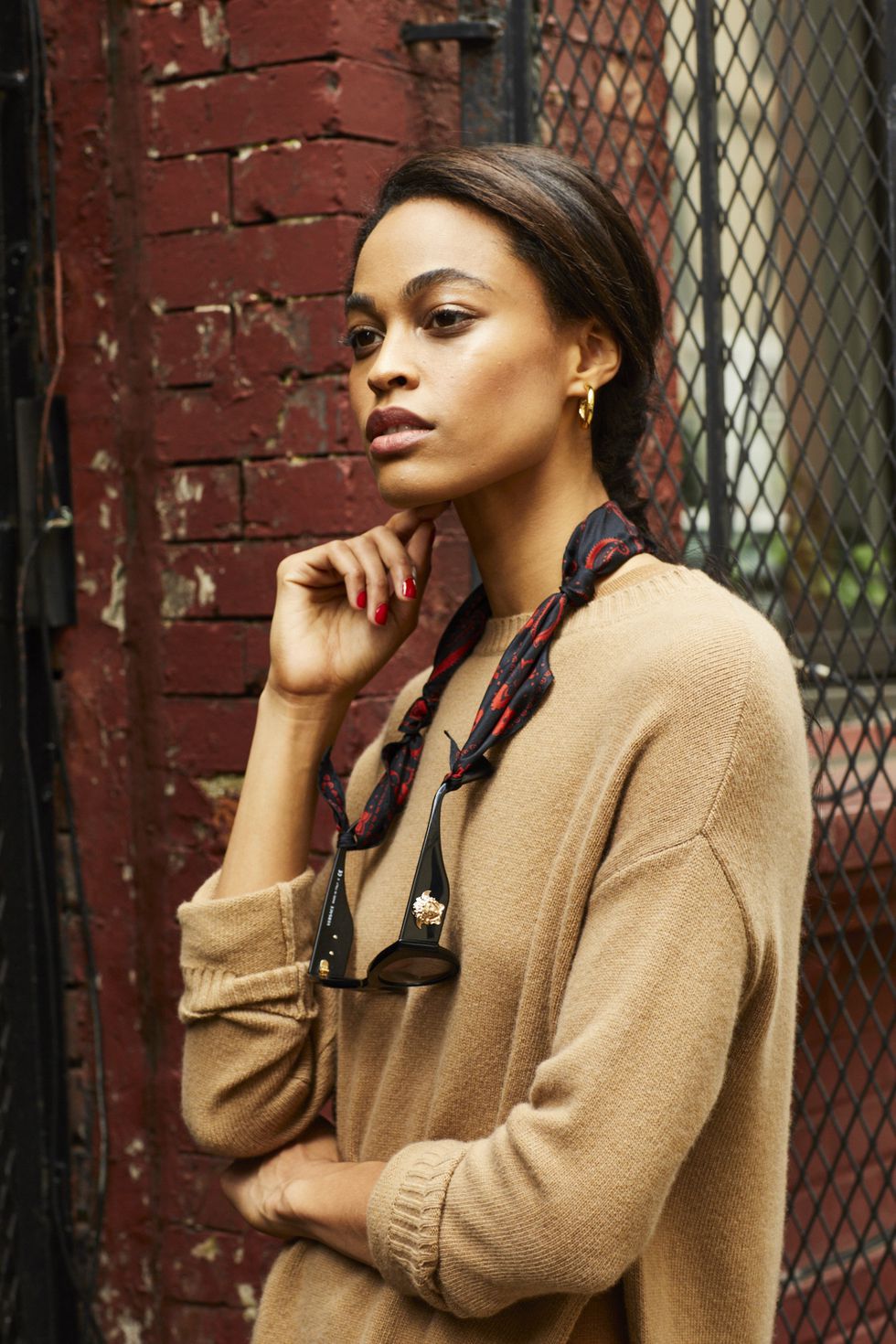 Credits: Coach scarf, $195; Versace sunglasses, $295; Hair and makeup: Mia Santiago at See Management |
