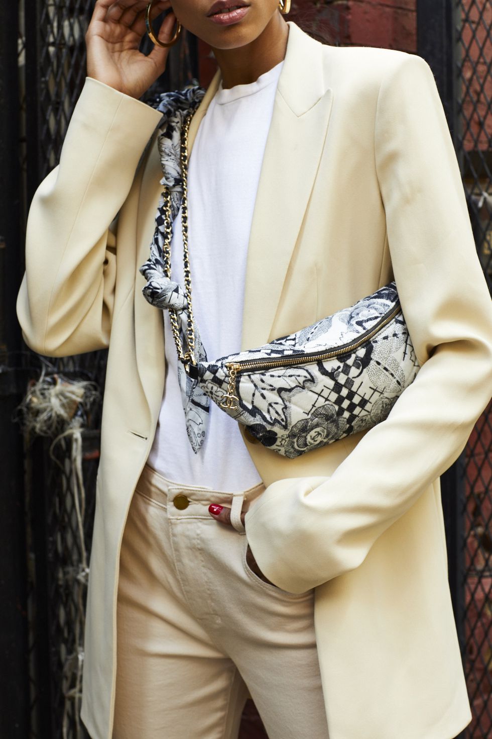 Credits: The Row jacket, $2,190; Levi's top, $35; Donna Karan pants $95; Chanel bag with scarf, $2,700; Hair and makeup: Mia Santiago at See Management |