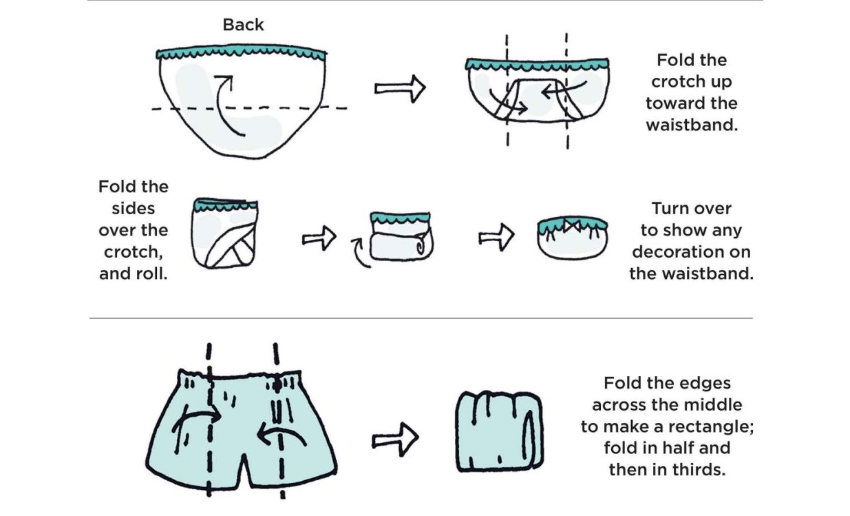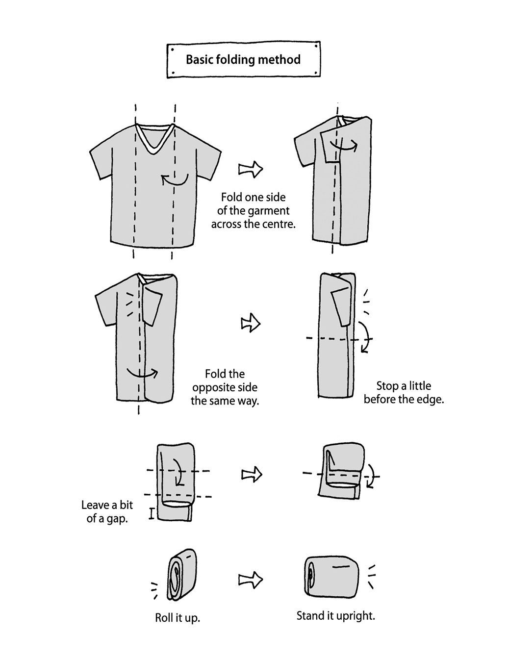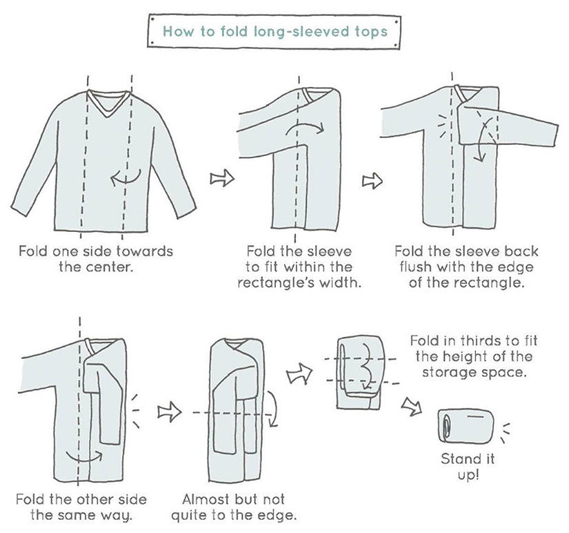 Trong cuốn sách Spark Joy của mình, Marie Kondo chia sẻ bí quyết gấp quần áo là không nên từ bỏ hay ngó lơ. Quần áo chỉ đơn giản là những mảnh vải hình chữ nhật được chắp vá với nhau. Bất kỳ món đồ nào cũng có thể được gấp lại thành hình chữ nhật, kể cả quần dài, nội y và tất.
