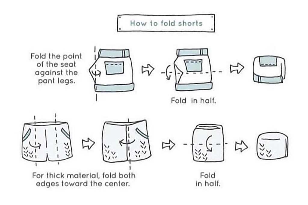 Tương tự với quần shorts, bạn có thể gấp đôi ống quần, sau đó gấp phần đũng quần hướng vào trong và xếp đôi quần lại. Đối với quần shorts từ những chất liệu dày dặn, chia thành 3 phần bằng nhau theo chiều dọc quần, gập 2 bên hướng vào giữa rồi gấp đôi lại. Gập đôi lần nữa nếu cần.