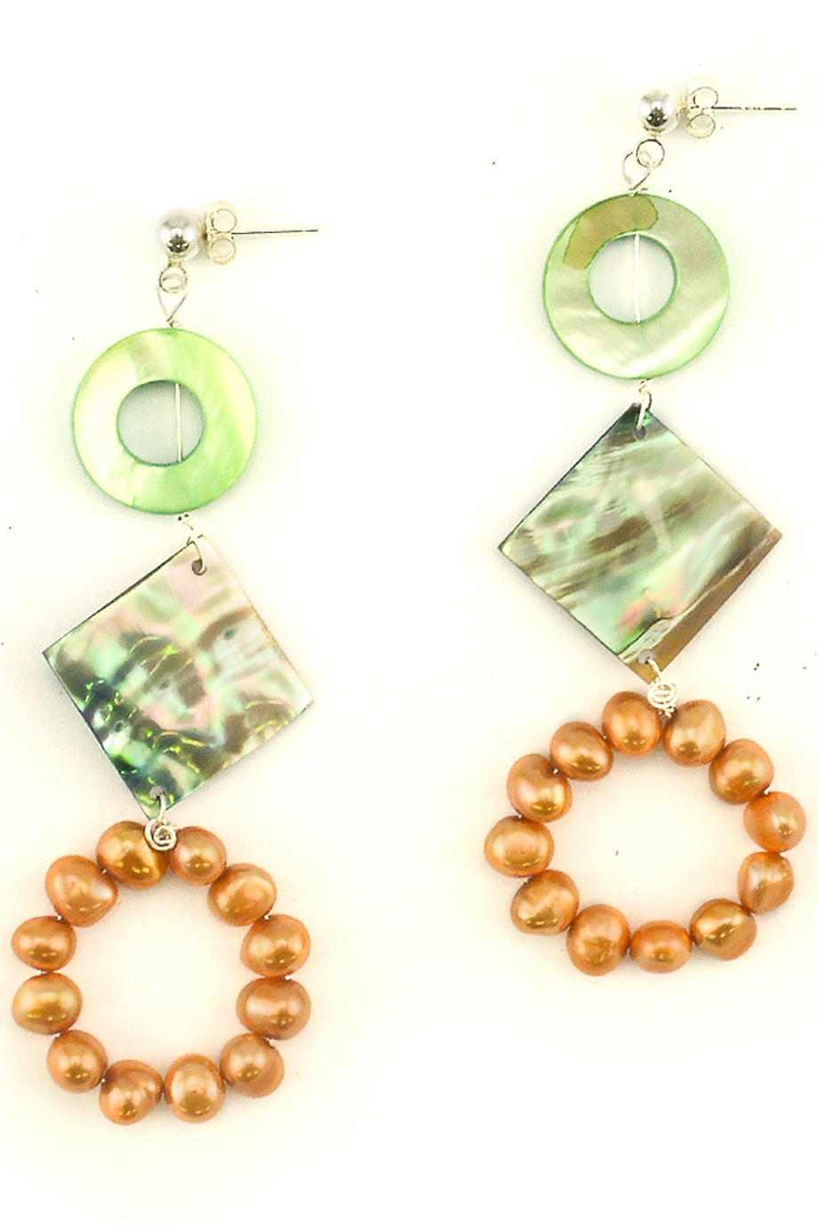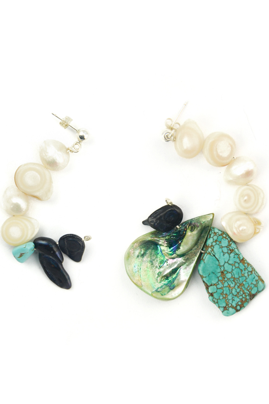 drop 5 & 7,5 cm, pearl, turquoise, mother of pearl, silver wire, silver stud pin, 25 gr