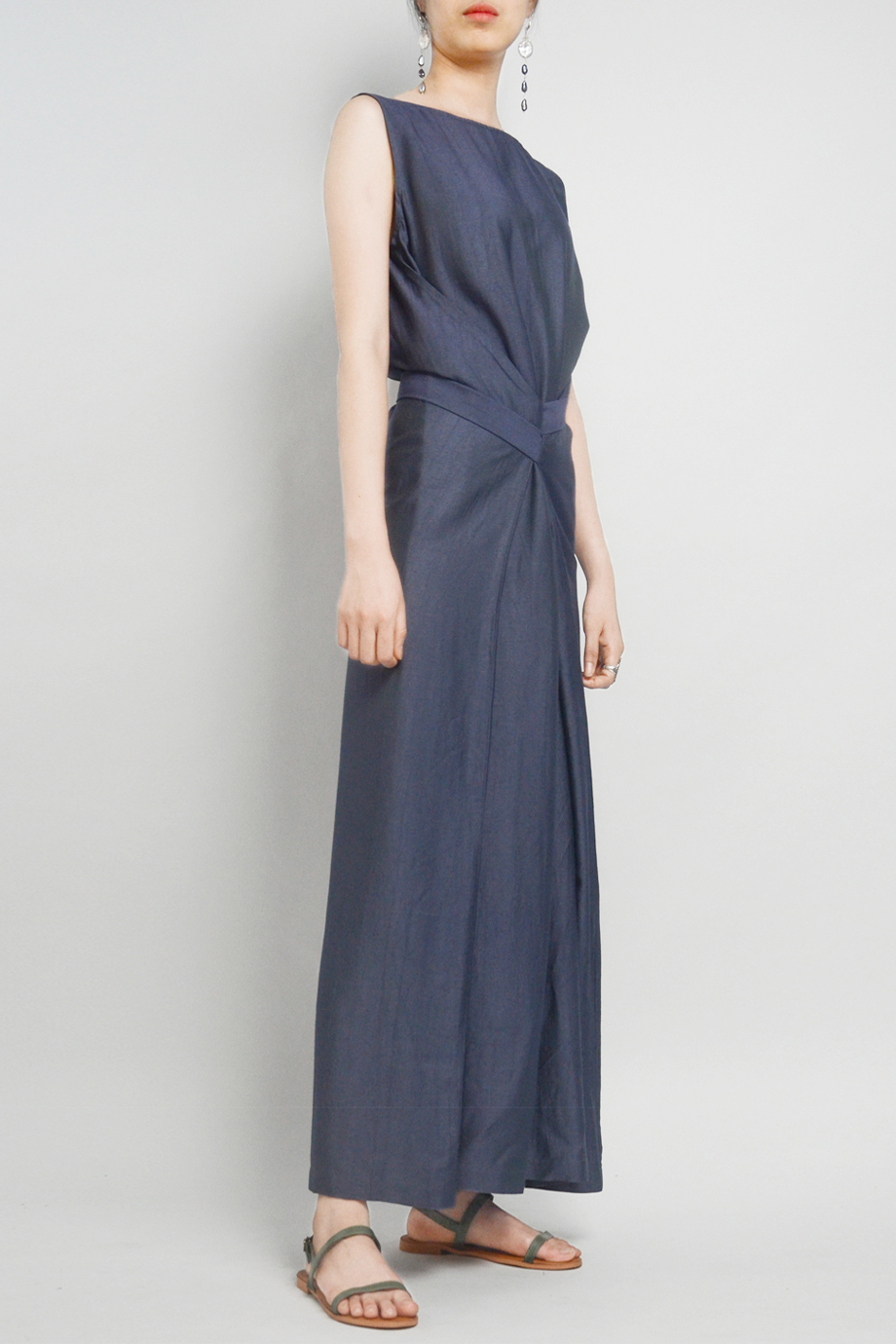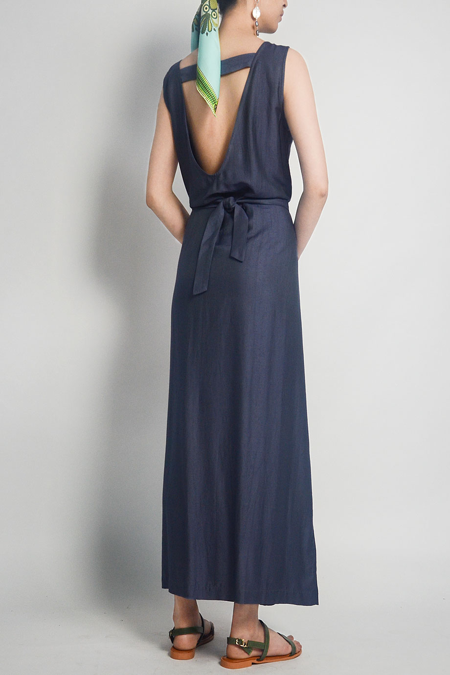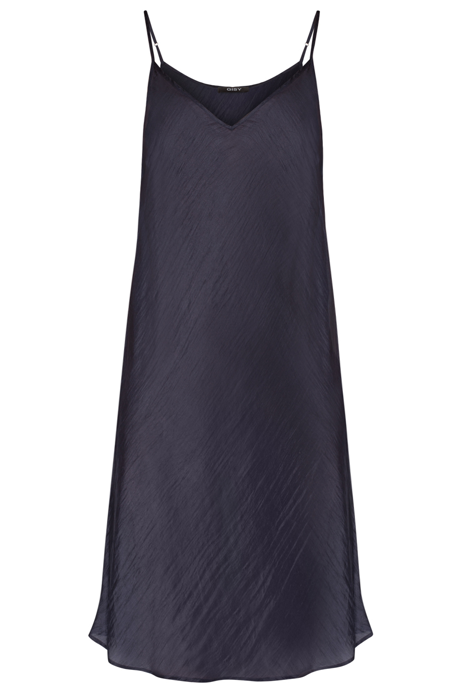 V-neck Silk Bias Cut Ankle Slip Dress/ Navy