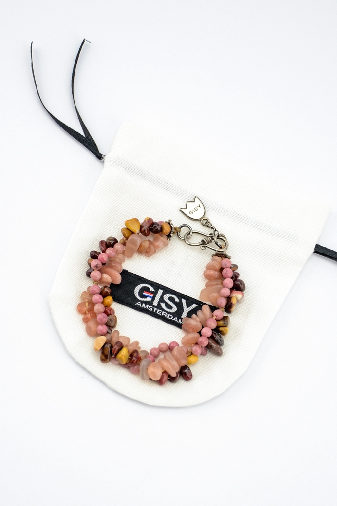 Handmade bracelet made from rose quartz, chalcedony, jasper and finished with the iconic silver 925 GISY tulip logo. Original length 18.7 cm. You can order your own length up to 21cm without changing in price.