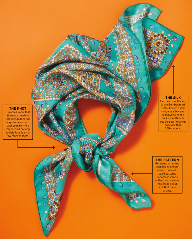 (1) Hermes là nhãn hiệu đầu tiên ra mắt chiếc khăn lụa chéo và sở hữu luôn danh từ "LE CARRE" (tiếng Pháp nghĩa là "hình vuông") để chỉ khăn lụa vuông của họ.