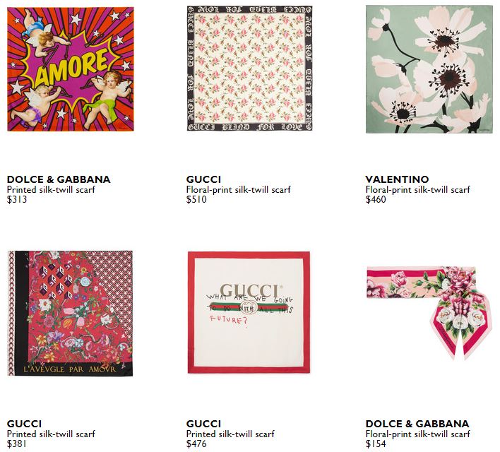 Nguồn: net-a-porter.com- Một số mẫu khăn lụa chéo in của các nhãn hiệu xa xỉ hiện đang bày bán (tháng 10.2018)