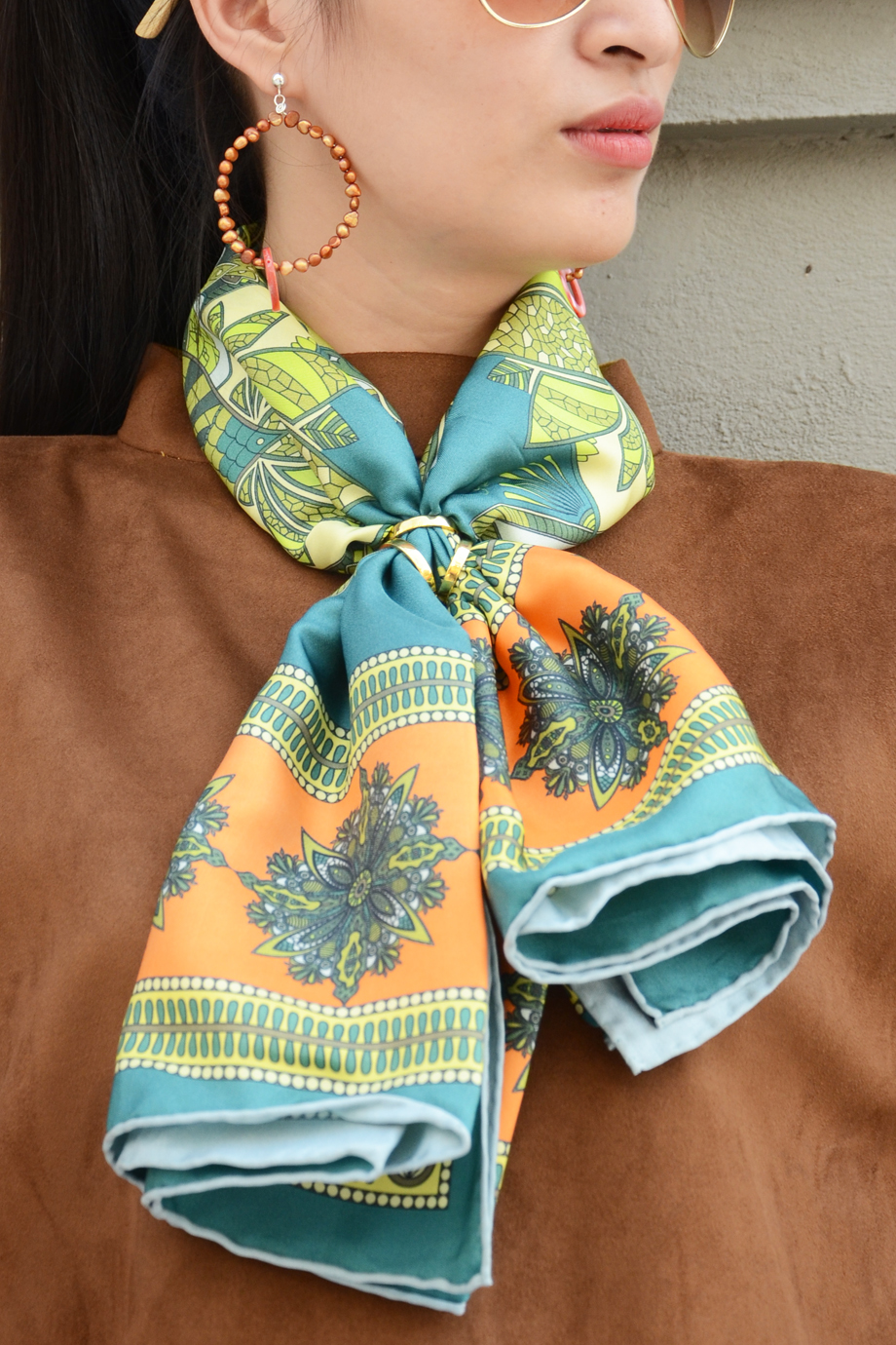 Use this scarf as many ways as your imagination can go, from summer to winter, from keeping your neck warm to wrapping your hair... Silk scarf are the easiest way to add prestige on basic outfit and make it the look of the day. Please check out the knots recommended in pictures.