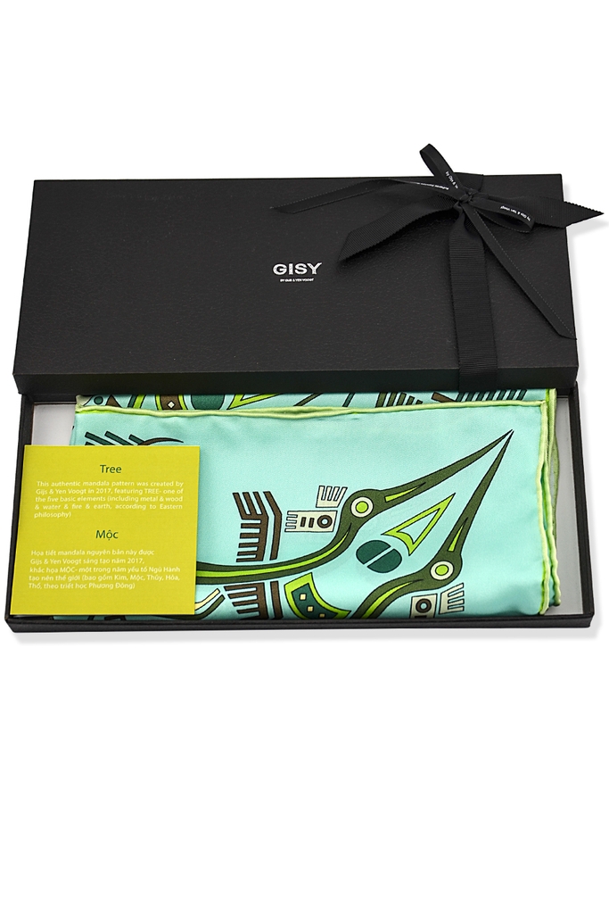 Chiếc khăn này nằm trong BST Khăn Thu 2017 GISY. Bộ sưu tập trưng bày 6 họa tiết mandala mới gồm “KIM”, “MỘC”, “THỦY”, “HỎA”, “THỔ” và “VIỆT NAM”. Những họa tiết này là bằng chứng điển hình về quan điểm Nghệ thuật- Triết học không tách rời của Gijs & Yen Voogt.