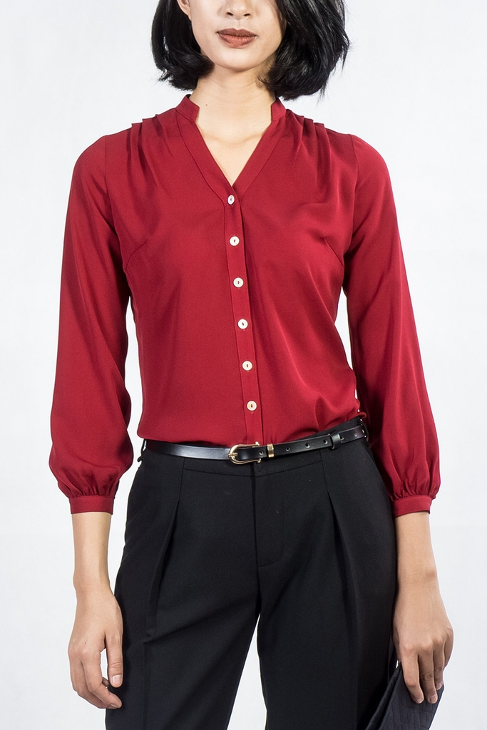 Được sử dụng bằng chất liệu 100% viscose mặt dệt habotai không co dãn, không nhăn, mỏng, nhẹ nhưng không trong suốt, cực kì mềm mại, là chất liệu được ưa chuộng của SANSAN nhiều năm qua, thiết kế đơn giản, điểm nhấn được tạo ra từ chiếc cổ tàu nằm và điểm xếp ly trên vai tạo ra sự độc đáo cho thiết kế.