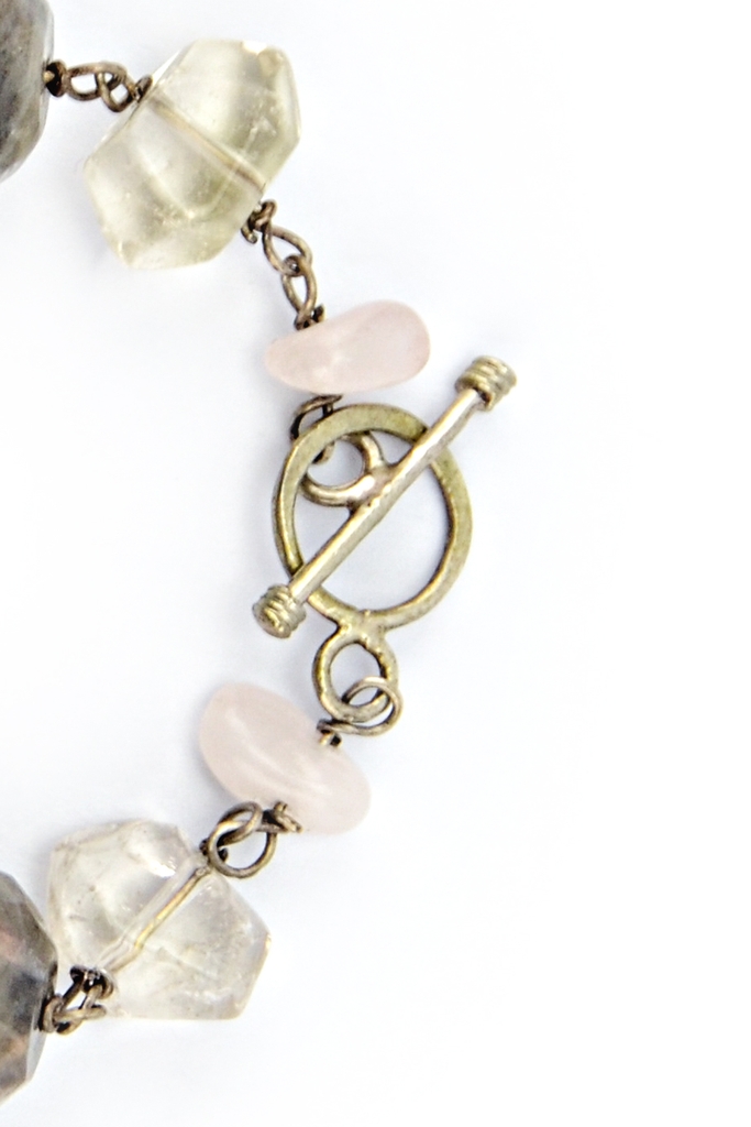 Vòng tay chế tác thủ công từ các viên đá thạch anh hồng, đá giảm stress labradorite và hoàng ngọc (citrine), liên kết bởi sợi bạc nõn (bạc 999) và hoàn thiện bằng khóa toggle bạc nõn. Chiều dài 17.5cm. Bạn có thể điều chỉnh độ dài tới 20cm mà giá vẫn giữ nguyên.