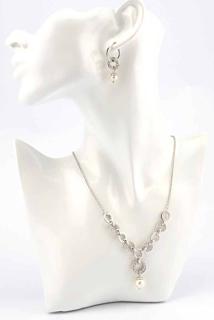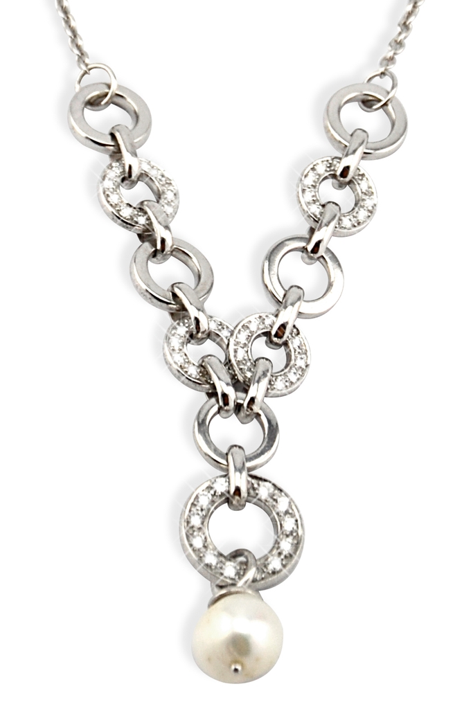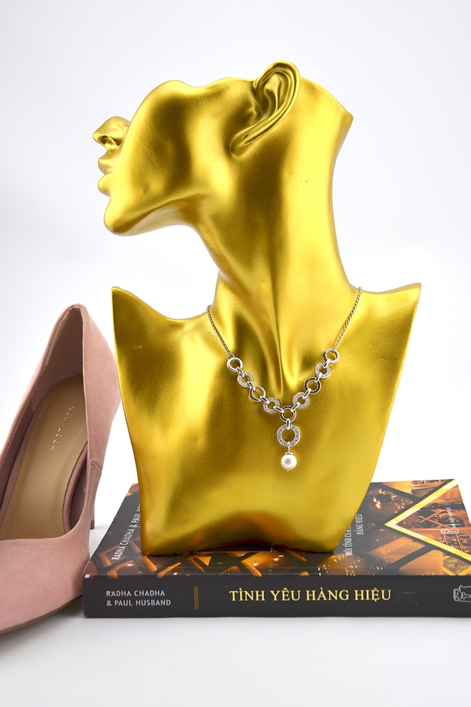 Vòng cổ full bạc 925 phối một viên ngọc trai ở trung tâm. Phong cách classy- fem sang trọng, nữ tính, hoàn hảo khi kết hợp với đồbộ suit công sở cổ thấp hoặc đầm cocktail cổ rộng.