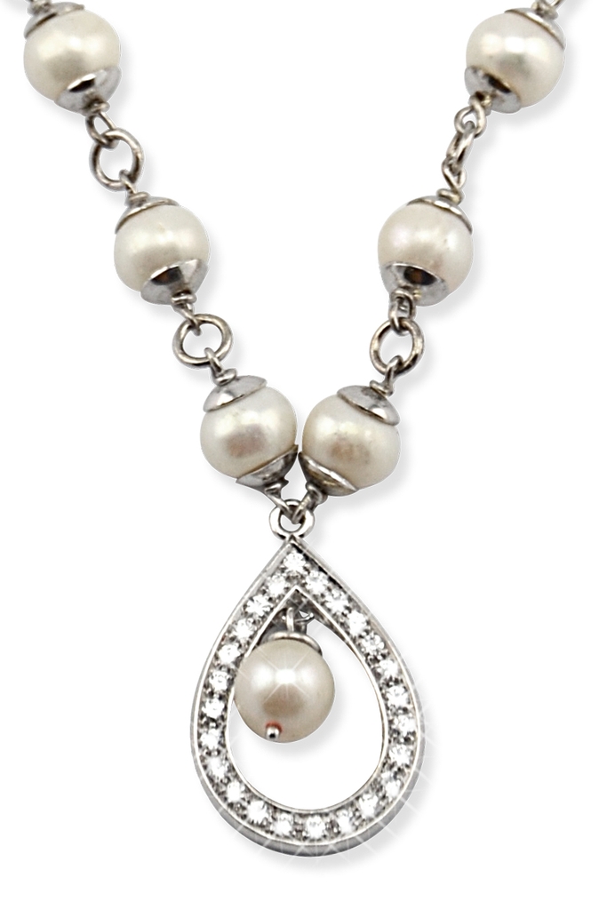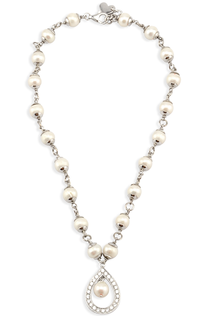 Vòng cổ chế tác tinh xảo từ ngọc trai trắng kem và bạc 925, kèm mặt dây treo hình giọt nước gắn pha lê.
