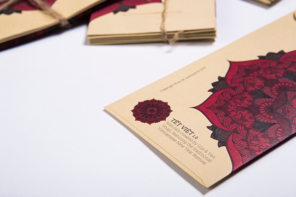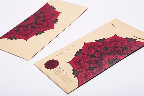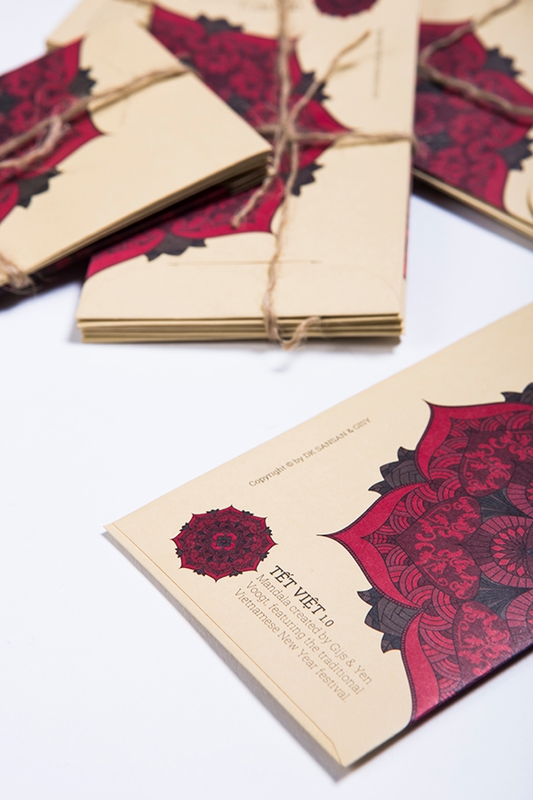 Vì lý do này, GISY đã thiết kế riêng một mandala chủ đề Tết Việt - nhấn mạnh là Tết Việt chứ không phải Tết Trung Hoa nhá! Hãy tìm trong mandala này biểu tượng của hoa đào, bánh chưng xanh, pháo tét và câu đối đỏ. Bạn đoán đúng rồi đấy, chúng tôi in mandala này lên giấy kraft và làm thành phong bao. Phong bao chất lượng cao, và giá cũng không rẻ- 24.000đ một gói 6 chiếc. Ấy vậy nhưng nhiều khách hàng vẫn đặt hàng thùng về để dùng dần, bạn biết vì sao không?