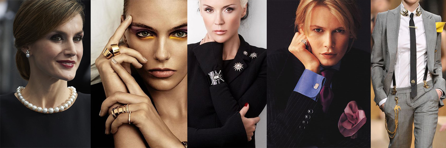Điển hình trang sức CLASSY gồm có: vòng cổ/ bông tai/ vòng tay ngọc trai đại dương hạt tròn đều và các trang sức vốn thuộc về đàn ông như: đồng hồ đeo tay, cufflinks (khuy cài măng séc), ghim cài ve áo vest (brooch), kẹp cà vạt.