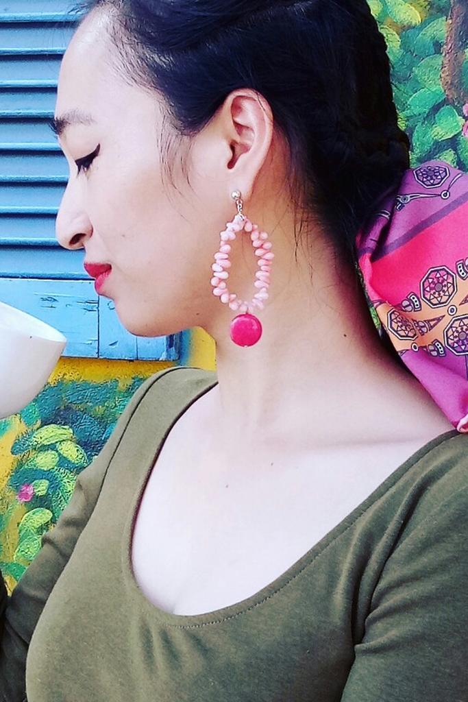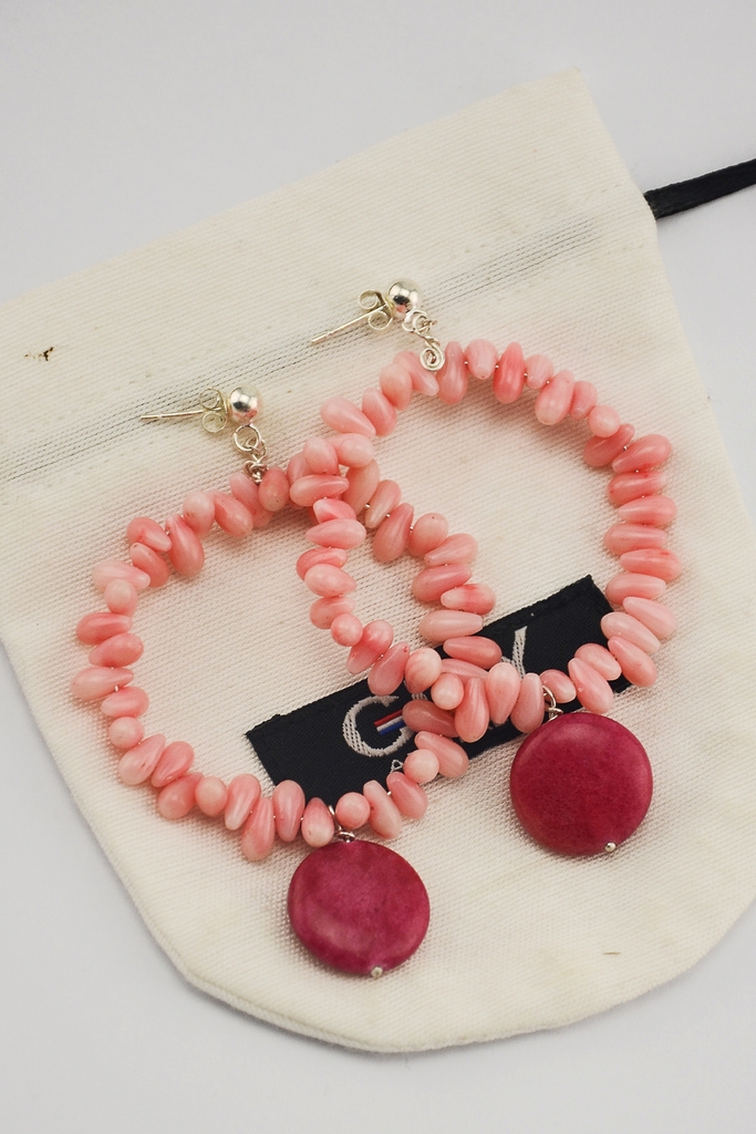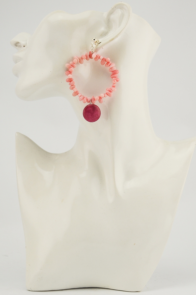 drop 8 cm, coral, chalcedony, silver wire, silver stud pin, 22 gr