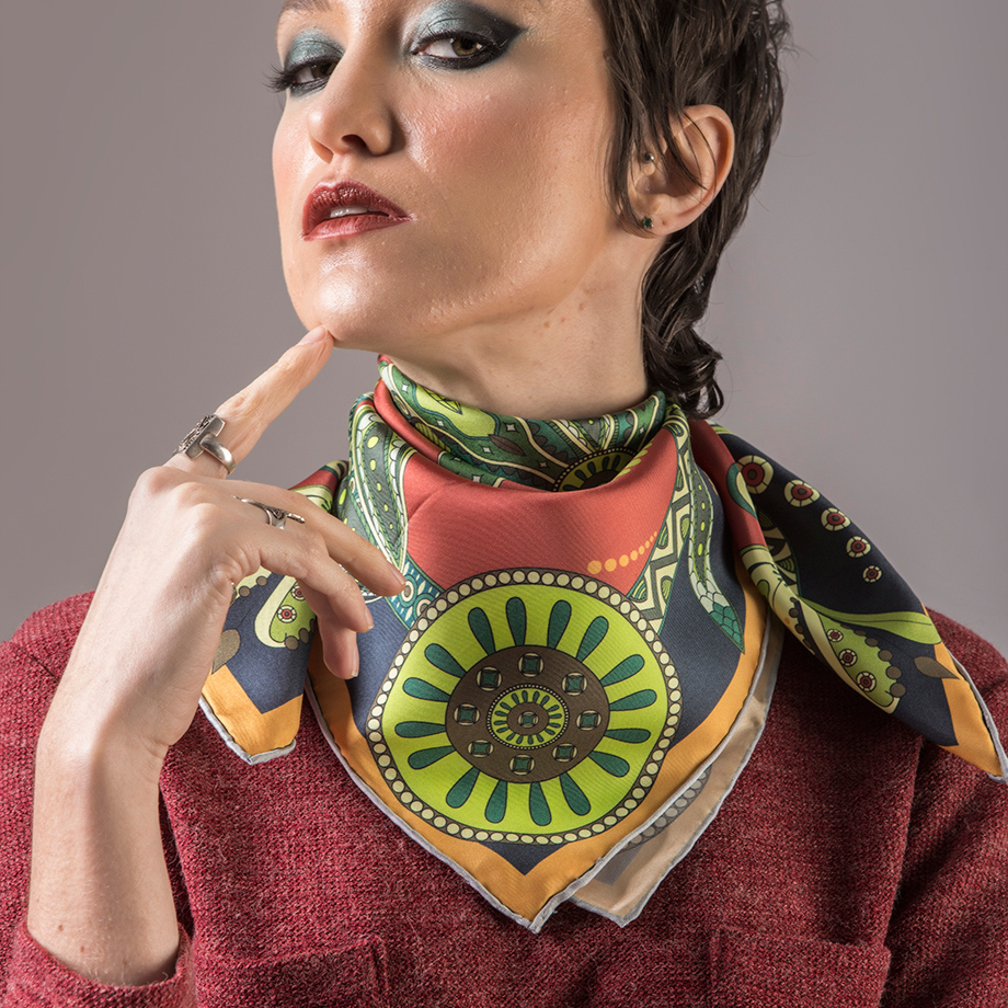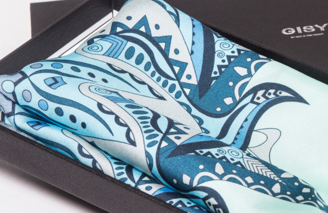 Một chiếc khăn lụa vuông 70cm in họa tiết mandala bản quyền nhãn GISY