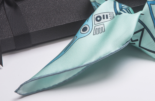 Khăn lụa vuông cao cấp sẽ có phần viền khăn khâu cuộn thủ công về phía MẶT PHẢI của khăn.