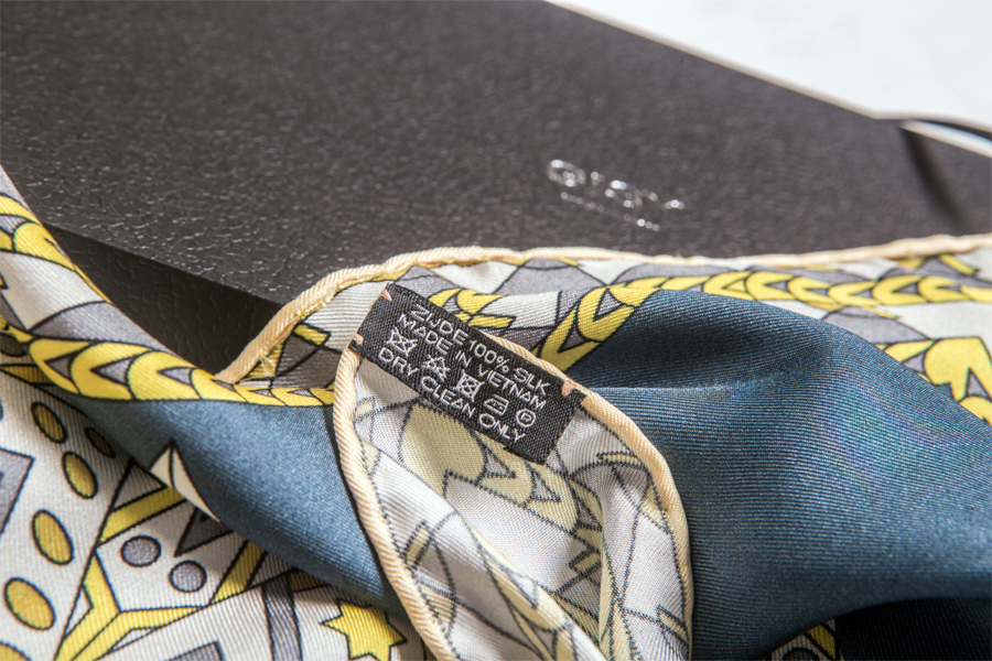 Trái với những gì mọi người vẫn nghĩ, nhãn tên thương hiệu trên khăn lụa cao cấp KHÔNG được khâu vào mép khăn mà nằm ngay trong hoa văn in trên khăn.