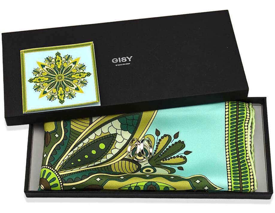 Một mẫu khăn lụa vuông 50cm nhãn GISY in hoa văn mandala Mộc tinh xảo bằng phương pháp in kỹ thuật số