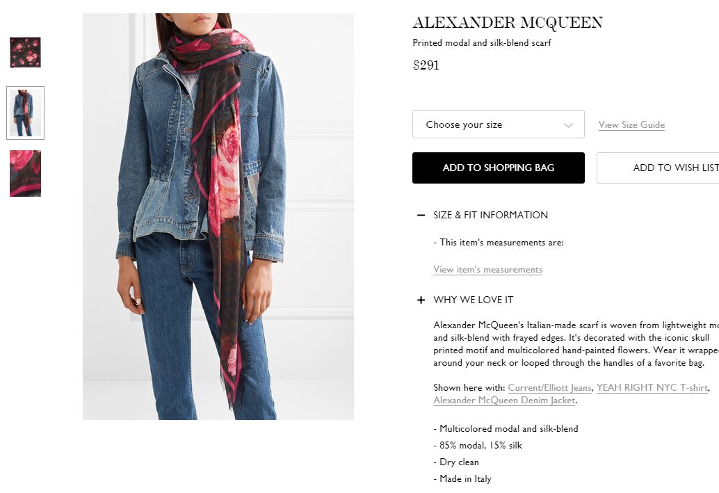 Nguồn: net-a-porter.com- Một chiếc khăn bằng 15% lụa pha 85% modal nhãn Alexander McQueen