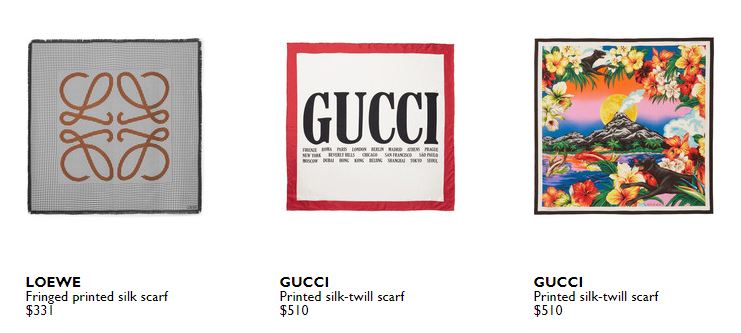 Nguồn: net-a-porter.com- Một vài mẫu khăn lụa chéo (100% silk twill) vuông cỡ 90cm, giá từ 331-510 USD/ chiếc tùy thương hiệu