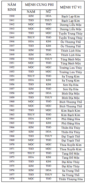 Để tra mệnh cung thì chúng ta phải có 3 dữ liệu: năm sinh của người cần xem - Giới tính của họ - và sử dụng Bảng tra mệnh cung phi bát trạch (như hình dưới đây)