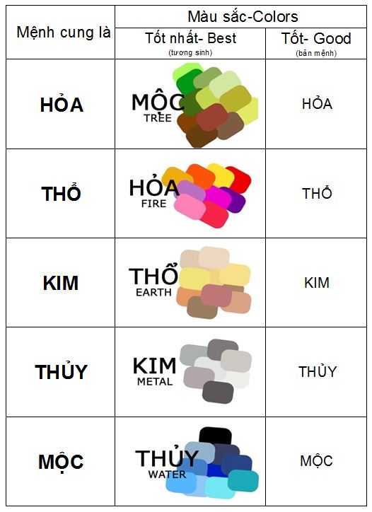 Bây giờ bạn đã tra cứu được mệnh cung chính xác của mình rồi, hình dưới đây mô tả trực quan các màu sắc thuộc về bản mệnh của bạn: